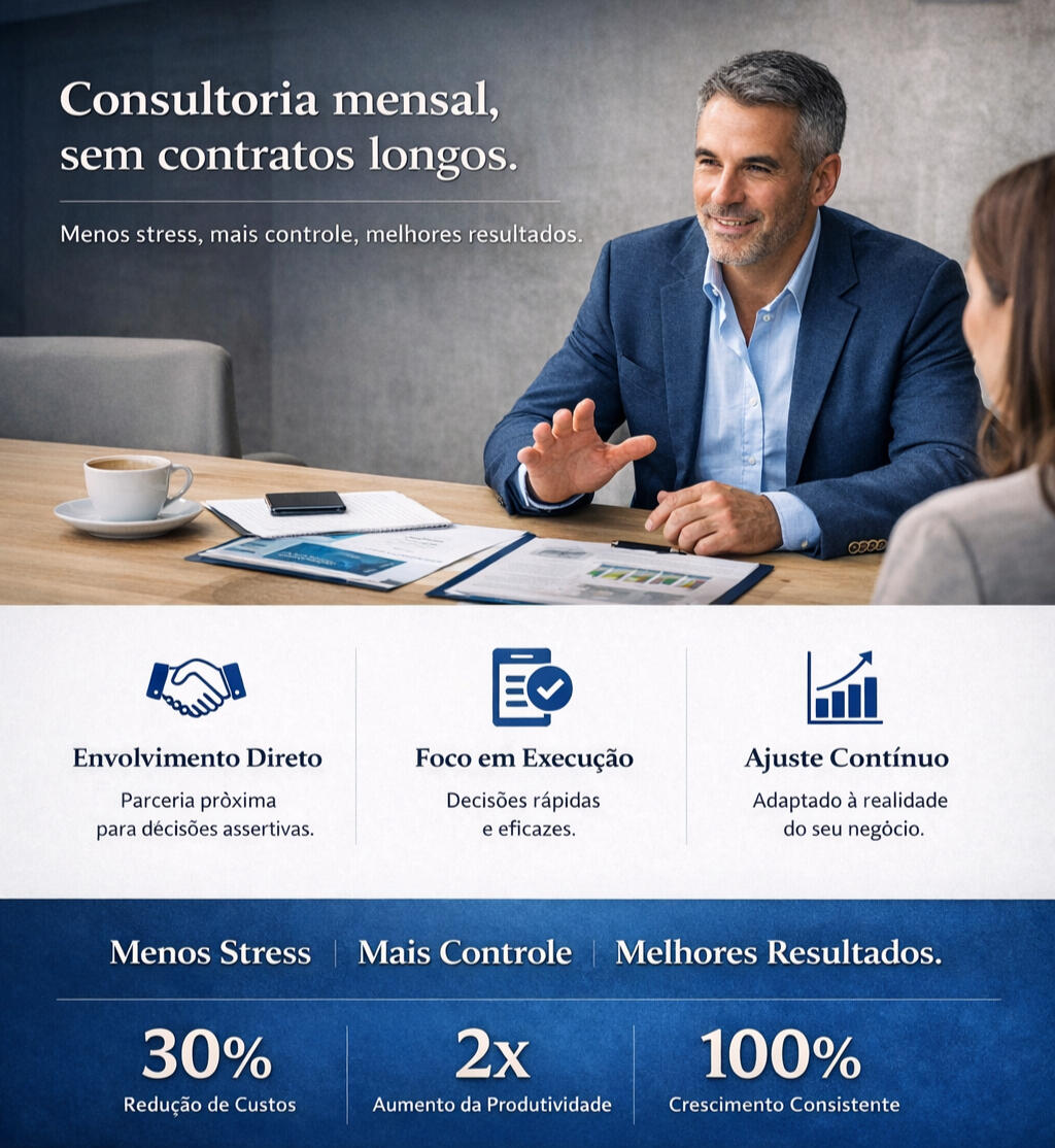 Consultoria mensal, sem contratos longos.• Envolvimento direto• Foco em decisões e execução• Ajuste contínuo à realidade do seu negócio.Objetivo:Menos stress, mais controlo,
